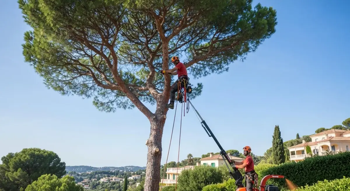Abattage d'un grand pin parasol en zone résidentielle à Mougins. Travail propre, délai respecté, crédit d'impôt appliqué sans problème.